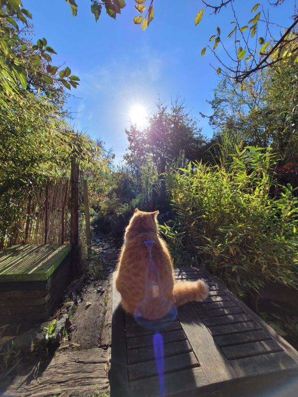Das wurde ja auch Zeit an diesem asig kalten patschnassen Morgen, dass Du der Miez eine von unten trockene und warme Matte in die Sonne legst!