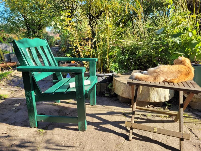 Insgesamt 4mal hab ich Stuhl, Buch und Tisch an neue Plätzchen getragen.Katz kam hinterher getrottet,meckerte am neuen Platz, wurde auf den Tisch gehoben und weiter gings mit Sonnenbaden ;D...