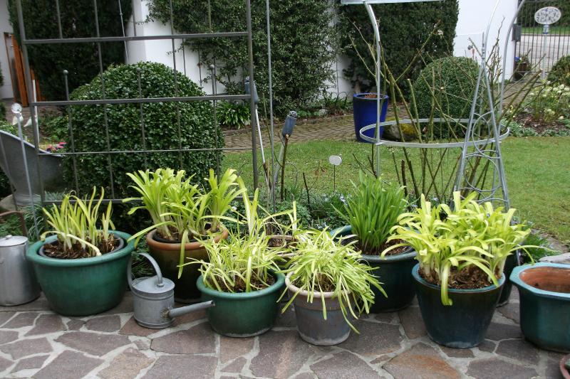 Ich habe meine Agapanthuse schon draußen stehen, seit ca. 1 Woche. Die kalten Nächte habe ich sie noch mit Vlies zugedeckt, aber die letzten stehen sie schon ohne draußen. Sie haben schon soweit ausgetrieben und sind noch ganz gelb. Die Sonne fehlte. Aber jetzt werden sie schon langsam grün.