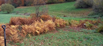 Die Böcke kamen auch weiter. Jetzt muss ich zeitnah abzäunen. Das ging gestern nicht, weil wir gestern allesamt die 5 Bäume gepflanzt haben. Meine Pfosten sind noch nicht da, herrje. Heute soll es Sturm geben. Auf jeden Fall sind sie nun drin. Muss ich hinterher halt kontrollieren. Ich kam mir zwischendurch vor wie ein Packesel. Lena hatte den Farn und die Brombeeren aus der Hecke gesenst. Unser Wwoofer hat mit der Spitzhacke Löcher geschaffen. Aber im Boden - ein Naturparkmitarbeiter nannte die Dinger mal höchst passend Stromleitungen - steckten halt diese dicken Farnwurzeln. Die überigens auch erklären, warum da weder außer Brombeeren anderes Fuß fassen kann, noch de Farn "auszurotten" geht. Dieses Jahr übrigens mangels FRost total fatal. Unsere Fläche ist auf der einen Seite knatsch farngrün. :P Jetzt wäre der Trecker für diesen Problembereich gut gewesen. Zeitlich ist derzeit sensen des großen Bereichs nicht drin. Nicht schon wieder.