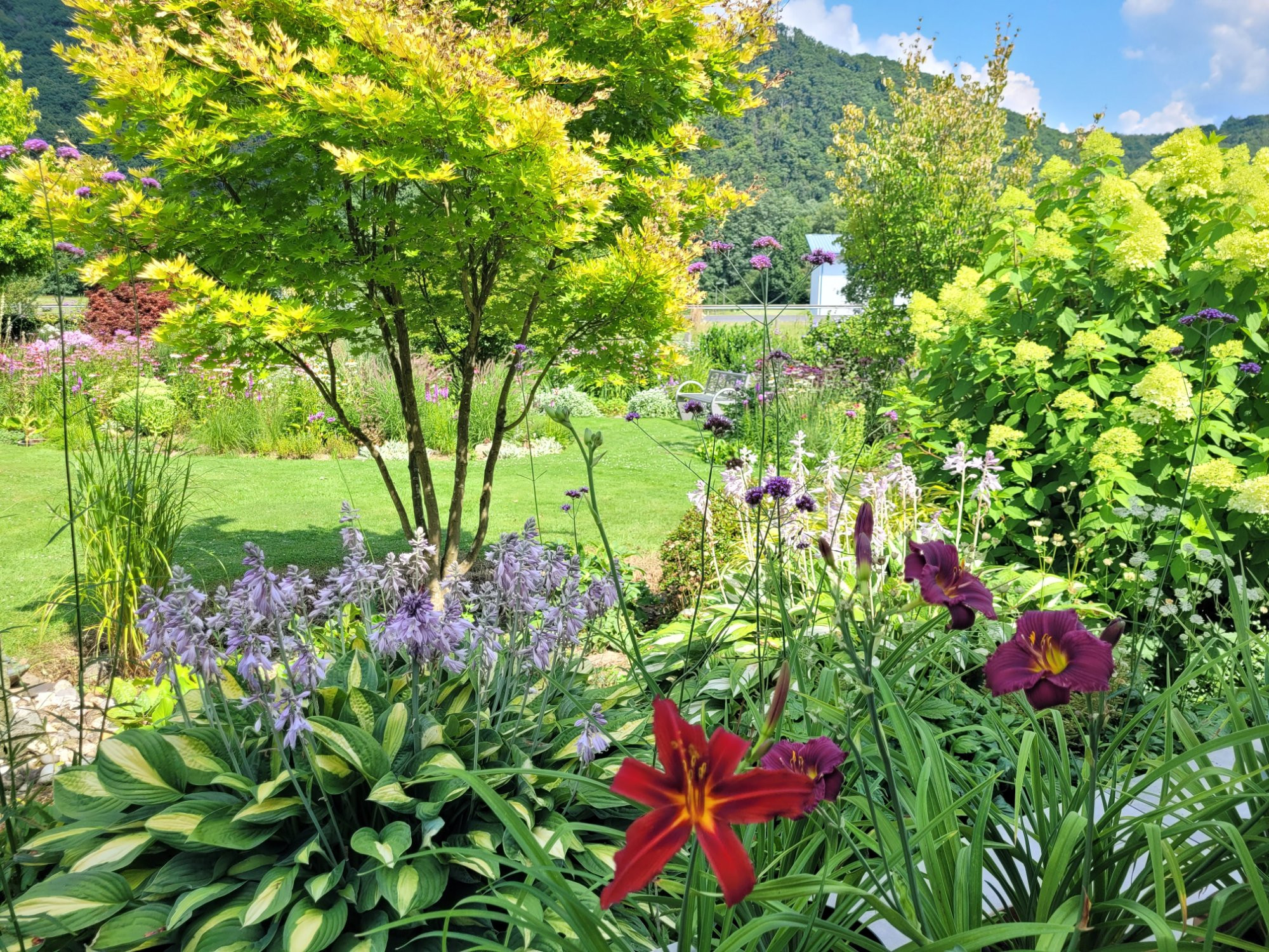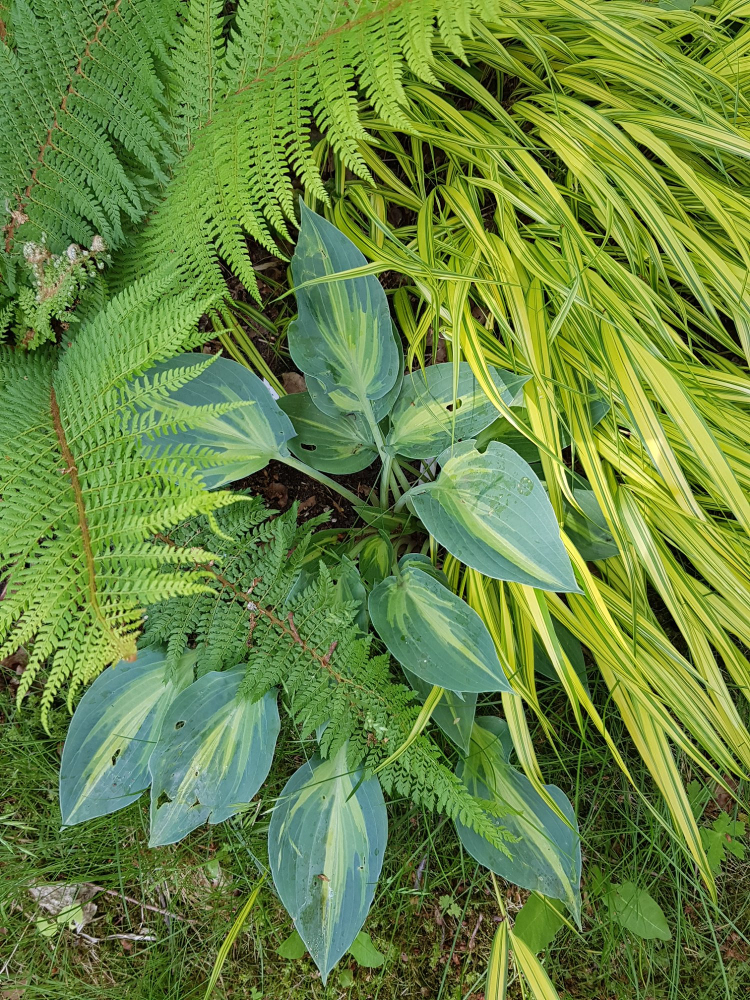 Hosta und Hakonechloa ( im Hintergrund) , dazu Hemerocallis...