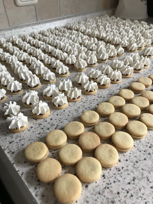 Roeschen, die Eiweißmasse muss man lt. Rezept ca. 10 min über Dampf schlagen. Dann ohne Dampf 5 min weiterschlagen. Dann Kokos drunter. Makrönchen so groß wie die Mürbteigplätzchen spritzen, bei Heißluft 100 Grad mehr trocknen als backen.