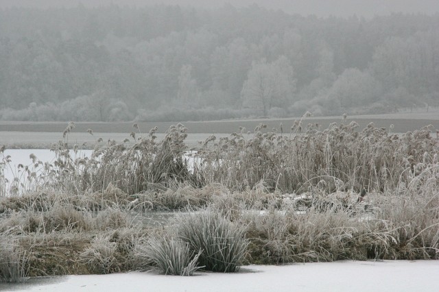Der 3. Februar war wohl für viele Rauhreif-Fanatiker ein sehr reizvoller Tag. Bei uns hate der Reif alle pflanzlichen Teile überzogen Etwas düster war es, so hat sich die Stimmung fast bis Mittag erhalten. Nach dem Blick aus dem Fenster hatte ich diesmal die Kamera mit auf den Weg zur Arbeit genommen. Täglich fahre ich auf dem Weg zur Arbeit an drei Weihern vorbei, bei denen ich mir jedesmal bei Nebel und Rauhreif denke, da müsstest du jetzt mal aussteigen und die unwirkliche Stimmung fotografieren. Gestern habe ich den Wunsch nun endlich mal umgesetzt.Anbei die Bilder von dem kleinen Ausflug an die Weiher. So schön gestaltet wie Thomas oder Frank bekomme ich das leider noch nicht hin. Kann ja noch werden.Liebe Grüße ArtemisiaWeiherlandschaft mit Rauhreif 1