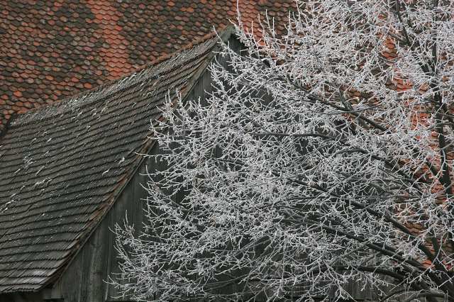 Weiherlandschaft mit Rauhreif 7Fachwerkreste gibt es schon, aber auch unschöne Anbauten, diese werden durch den bereiften Baum gnädig, wenn nicht sogar reizvoll verdeckt.
