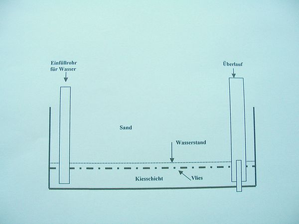 Habe mal ein bisschen in meinen alten Unterlagen gestöbert und folgende Konstruktion für das dauerfeuchte Sandbett gefunden. Die Idee ist nicht auf meinem Mist gewachsen, aber dennoch gut