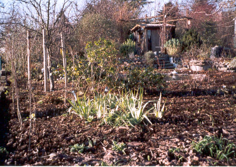 Und auch immergrün. Zum Beweis ein Photo von Sisyrinchium striatum im Februar. Sie hat sich unter dem Kirschbaum selbst ausgesät, und weil es ihr dort so gut gefällt, habe ich ihr erlaubt zu bleiben...S.m striatum ... ist bei uns nur in geschützten Lagen richtig hart
