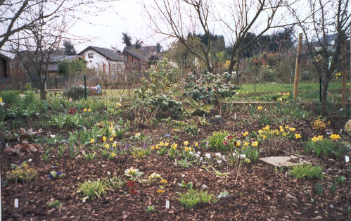 Na ja, halbwegs stramm... einige haben doch ziemlichen Seegang.Hier nochmal einen breiteren Blick über Zwiebeln und Stauden hinweg auf das Kamelienbeet. Inzwischen sind die Kamelienknospen alle braun gerändert.