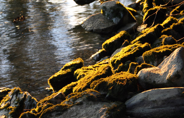 Steine am Ufer, mit Moos bewachsen. Man muss aufpassen, dass man nicht samt Fotoapparat ein unfreiwilliges Bad nimmt :o