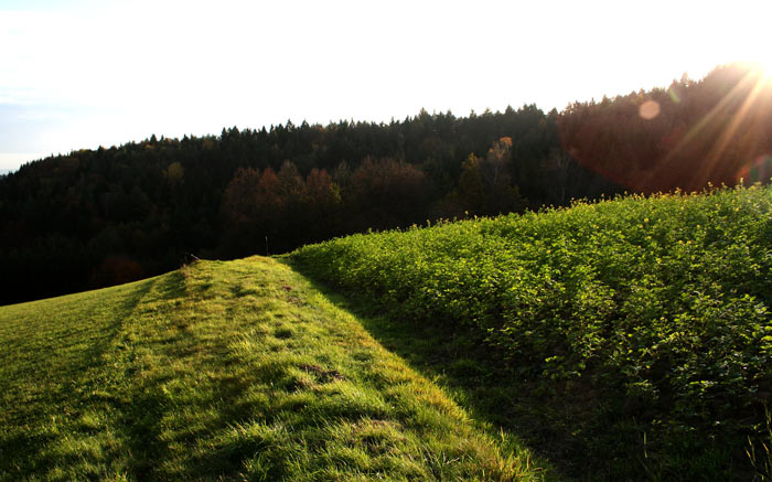 Nun nochmals das Feld aus einer anderen Perspektive. Ich brauche das satte Grün noch vor dem Winter. Ich speichere sozusagen Farben in meinen Gehirn ab, um im Winter davon zu zehren. Wie der Frederic von Leo Lionni.
