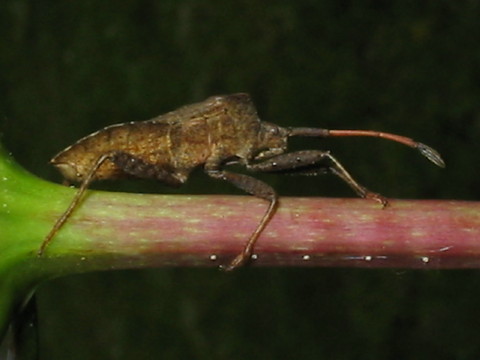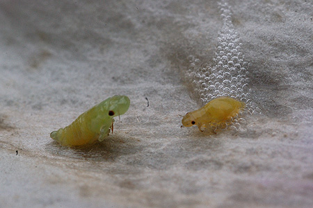 Und hier nochmal das Bild:... es dürfte sich um die Larve einer Florfliege handeln, die auf Bäumen und Sträuchern, ähnlich wie marienkäfer, Blattläuse jagen. Auf dem Rücken liegt der Kot der Larve, mit dem sich Florfliegenlarven üblicherweise tarnen.Auf dem Bild sind aber sehr schön der Kopf und die langen Kiefer erkennbar, die Körperform halbwegs zu erahnen!
