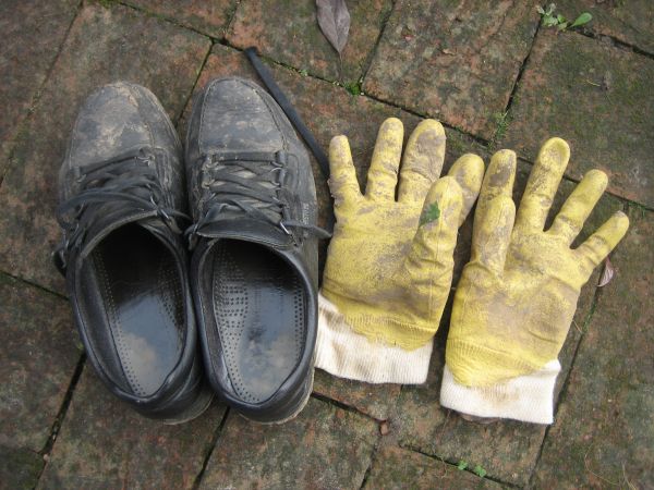 So sehen bei mir Schuhe und Handschuhe von April bis Mitte November aus ;D ;D. Im Juni, Juli, August arbeite ich bei schönem Wetter ohne Schuhe und Handschuhe, im Winter, wenn ich mal hier bin, trage ich die alten Schneestiefel auf, aber es fehlten mir immer die richtigen Handschuhe. Nun demnächst wohl nicht mehr :D