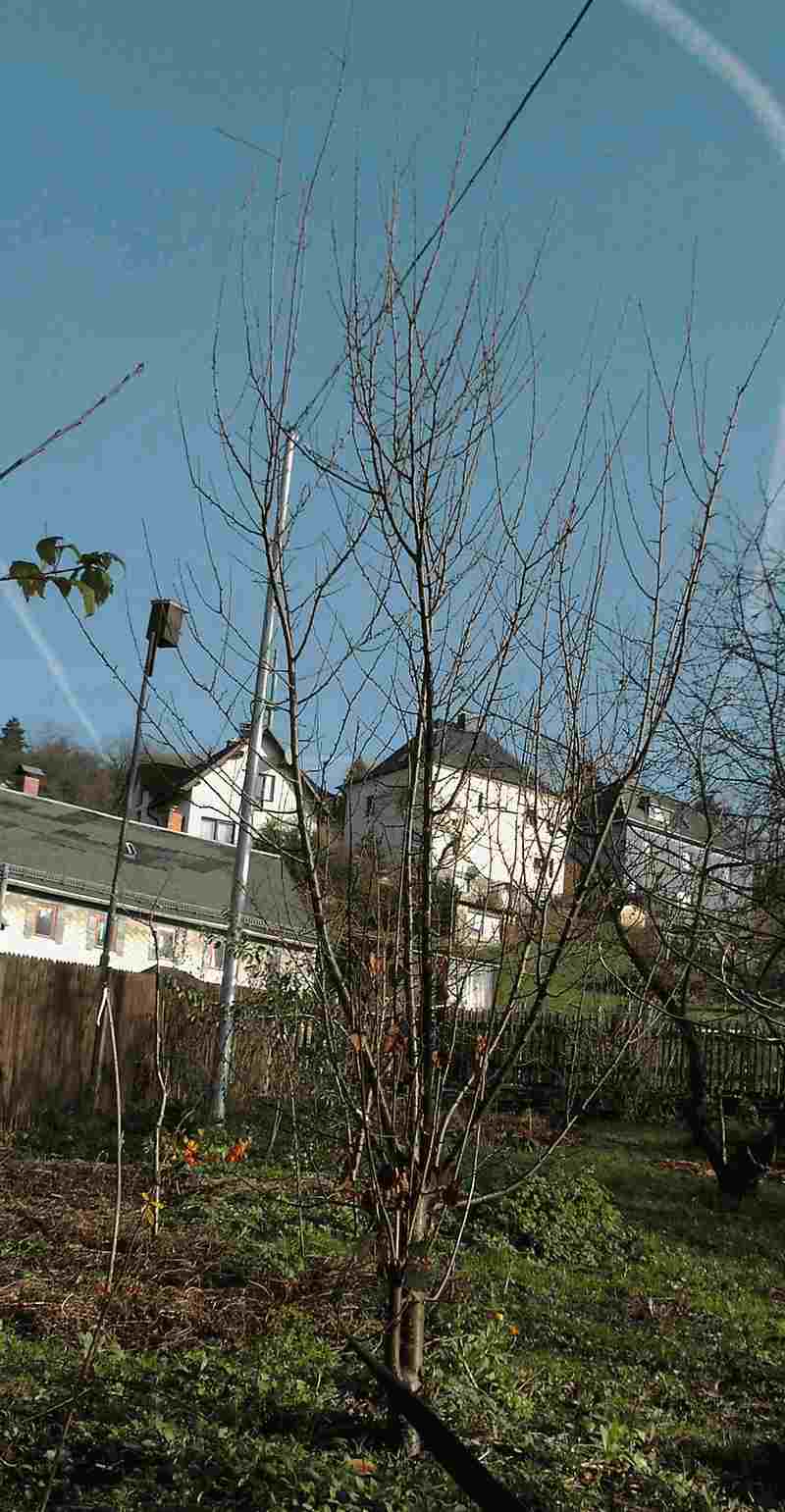 Hallo Andreas,soviele Fragen auf einmal!Heute habe ich versucht zu fotografieren, in die Digitalkamera neue Batterien eingesetzt - ein Foto hat geklappt, dann hat das Gerät blockiert. Mit abermals neuen Batterien konnte ich wenigstens das eine Bild überspielen, sicher sind bessere möglich!Der gesamte Baum misst 3,75 m in der Höhe, davon entfällt auf den Stamm 0,70 m. Der Wuchs ist recht schlank. In diesem, dem 4. Jahr nach der Pflanzung, hat er ordentlich zugelegt. Der längste jährige Trieb hat immerhin 1,40 m!Außer dem Pflanzschnitt und ein paar Veredelungsreisern wurde der Baum noch nicht geschnitten, das soll man auch nicht, bevor ein Obstbaum anfängt zu tragen.Das vorjährige Holz, auch wenn es nur Ruten waren, hat massenhaft Fruchtholz angesetzt. Daraus schließe ich, dass ein Fruchtholzschnitt unnötig ist, ein Entfernen der alten Triebe an der Basis, wie bei Wildobst üblich, ist zweckmäßig, um eine lockere Krone zu erhalten.Am Pfopfkopf ist nichts aussergewöhnliches zu entdecken.Im vergangenen und in diesem Jahr hat die Schlehe voll geblüht. Trotzdem bin ich bislang nicht zufrieden. Die Frucht hat eine längliche Form, schmeckt angenehm säuerlich und ist bereits im September reif. Doch leider sehr anfällig Krankheiten gegenüber. In diesem Jahr fiel die Mehrzahl der Früchte der Pflaumensägewespe zum Opfer. Mein Garten befindet sich in einer geschlossenen Tallage. Möglich, dass Du bessere Bedingungen hast.Gruß GG