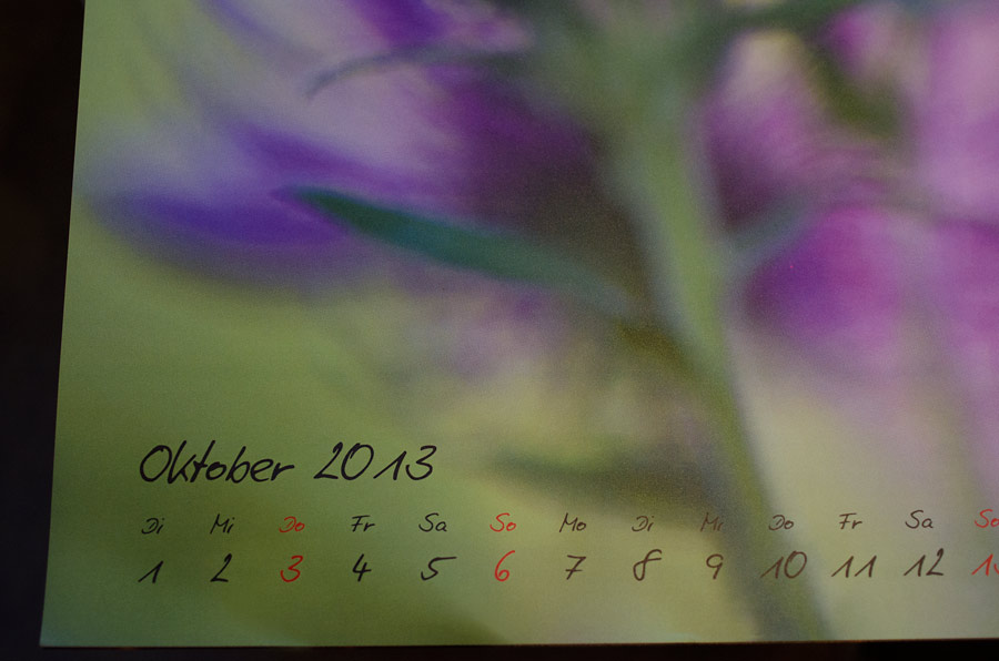 Ich lasse meine Kalender immer noch dort drucken, habe es aber auch mit einem EchtFotokalender bei Saal versucht.Die Qualität der Bilder im Saal-Kalender ist wesentlich besser als die bei meinbildkalender, aber Saal bekommt sein Fotopapier auf Rollen geliefert, während meinbildkalender das Papier für den Digitaldruck in Bögen flach geliefert bekommt. Das Ergebnis ist, dass der Saal-Kalender nicht flach auf der Wand liegt, sondern sich wölbt, Saal hat leider keine Lösung für dieses Problem. Also bleibe ich bei meinbildkalender. Bei meinen Makrofotos ist das schade, bei anderen, detailreicheren Bildern fällt die schlechtere Druckqualität des Digitaldrucks nicht auf.Ich lasse das Kalendarium im Bild "verschwinden". Es gibt kein dickes Kalendarium neben oder unter dem Bild, sondern ein Kalendarium - nur die Schrift - unten im Bild.Nachtrag: meinbildkalender ist eine sehr kulante Firma. Kürzlich habe ich eine größere Anzahl Kalender bestellt und dann kam noch eine Nachbestellung eines einzelnen Kalenders hinzu, man konnte diesen nicht mehrr in die vorhergehende Bestellung integrieren, aber ich bekam einen Gutschein in Höhe des Portos.