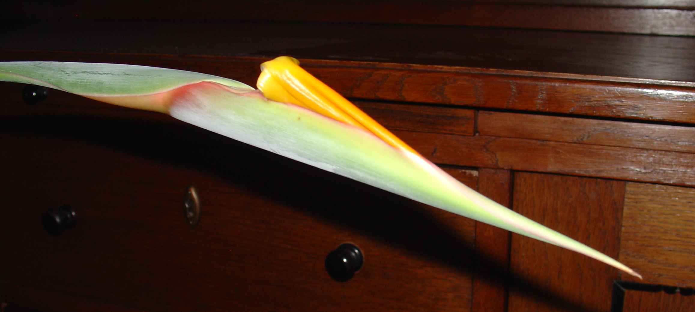 Fast genau nach einem Monat ist die Blüte halb auf!Und es sind weitere zwei im Anmarsch.Ich habe tatsächlich ein wenig nachgeholfen. Als die Knospe schon eine deutliche Beule mit orangem Schimmer hatte, habe ich vorsichtig das Hüllblatt etwas auseinandergezogen.