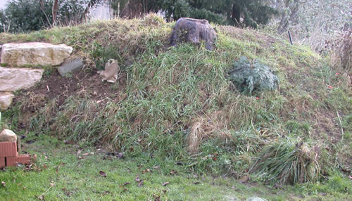 Berta, unser Gelände hatte einige alte Bäume. Ein paar liessen wir stehen, andere mussten weichen. Vor vier Jahren richtete ich hier einen Kinderspielplatz ein. Mit einem Hügel und einem grossen Sandkasten. Der Baumstamm lieferte Rundhölzer für den Sandkasten, und einen Wurzelstock liess ich mit dem Bagger auf dem Hügel einbauen. Dort sassen die Kinder öfters drauf und konnten den ganzen Garten überblicken, es war ihr Königsstuhl, wie sie sagten. Die Kinder sind nun grösser und nicht mehr so oft dort, und nach vier Jahren beginnt der Wurzelstock sich nun auch langsam zu zersetzen. Jetzt habe ich daneben einen Baum gepflanzt - Blauglockenbaum - so wird sich der Hügel mit dem Wurzelstock langsam verändern. Später werden dann noch Farne dazu kommen. Auch nehmen Rosen langsam aber sicher den Hügel in Beschlag (unter dem Winterschutz wartet eine SDM auf das Erklettern des Baumes gegenüber. Hier die Winteransicht, eher nüchtern: