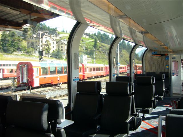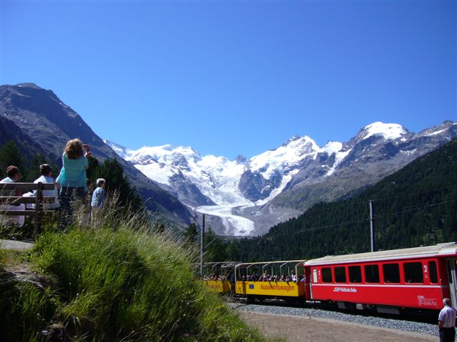 Der Bernina Express bring die Fahrgäste in tollen Panoramasichtwagen von Chur nach Tirano (Italien).Diese Bahnlinie ist die einzige offene Alpenüberquerung in Europa ,in nur 38 Kilometern überwindet der Zuge die 1824 Höhenmeter zwischen „Ospizio Bernima“ 2253 m und Tirano, das schafft sie mit Kehrtunnels und dem grossen kreisviadukt bei Brusio.In Poschiavo 1014 m wird sie zur Strassenbahn, denn die Gleise verlaufen mitten auf der Strasse-
