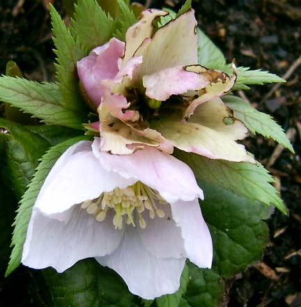 Ich finde auch oft Blüten mit Löchern oder angenagtem Rand. Meiner Ansicht nach sind es kleine Schnecken. Aber hilft da wirklich Schneckenkorn? Der Lockstoff soll doch ein Sexuallockstoff sein und auf geschlechtsreife Schnecken wirken, oder? Das würde die kleinen Biester aber dann nicht ansprechen. Diese anemonenblütige Helleborus ist eine der ersten in meinem Garten, die mit der Blüte beginnt. Ich habe sie von Hans Kramer. Es ist eine sehr schöne kräftige Pflanze, die reichlich blüht. Die Stiele sind noch kurz, aber sie wird sich noch strecken. Auch habe ich noch nicht alle Blätter abgeschnitten. Sie schützen die Knospen und Blüten, ebenso wie das Laub, das ich zwischen die Stiele gestopft habe. Fleckiges Laub schneide ich nach Bedarf heraus, spätestens aber, wenn die Pflanze in voller Blüte steht.