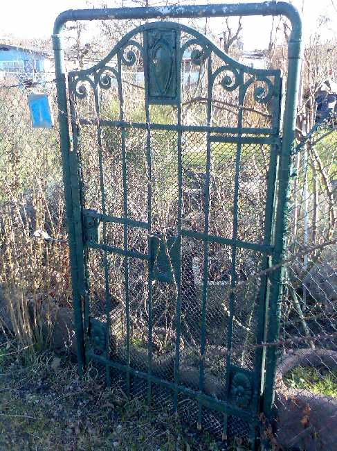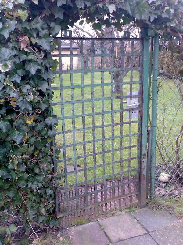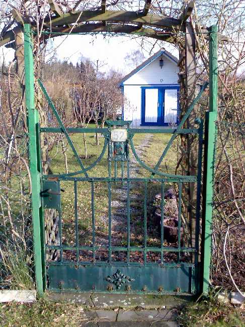 das alte gartentor meiner oma. nachdem sie gestorben war, hatte mein vater den garten für zehn jahre verpachtet und nach ein paar jahren dieses alte tor abgerissen und durch ein leider ganz nichtssagendes ersetzt. na, wenigstens ist es nicht zu arg häßlich...die kugeln hat er gerettet und in seinen hausgarten mitgenommen. ich werde demnächst die verhandlungen über die herausgabe dieser kugeln eröffnen - denn jetzt gehört der garten mir! ich fürchte aber, der preis wird in mehreren kisten wein bestehen, mindestens...