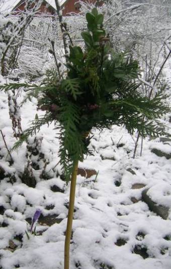 So ähnlich sehen bei uns die traditionellen "Palmbuschen" aus, die je nach Gegend aus einer bestimmten Anzahl (meist 9) verschiedenen Gehölzzweigen mit mystischer Bedeutung bestehen. Am Palmsonntag werden sie in der Kirche geweiht und von den Bauern auf die Wiesen und Felder gesteckt. Ein kleinerer wird als Schutzzeichen ans Kruzifix im Herrgottswinkel der Bauernstube gesteckt.