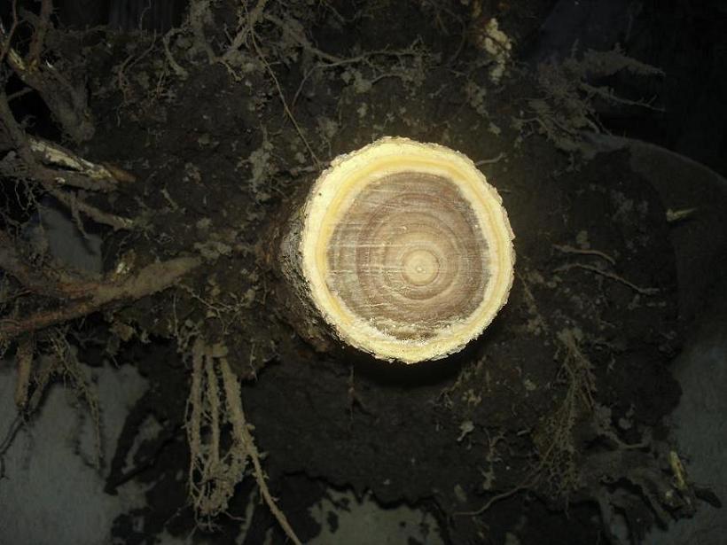 Da der Baum sowieso kaputt ist, bat der Baumschuler um Untersuchung des Wurzelballens. Beim Abschneiden des Stammes fällt auf, dass das innere Holz extrem anders gefärbt ist als die äusseren Bereiche. Ist das Normal?