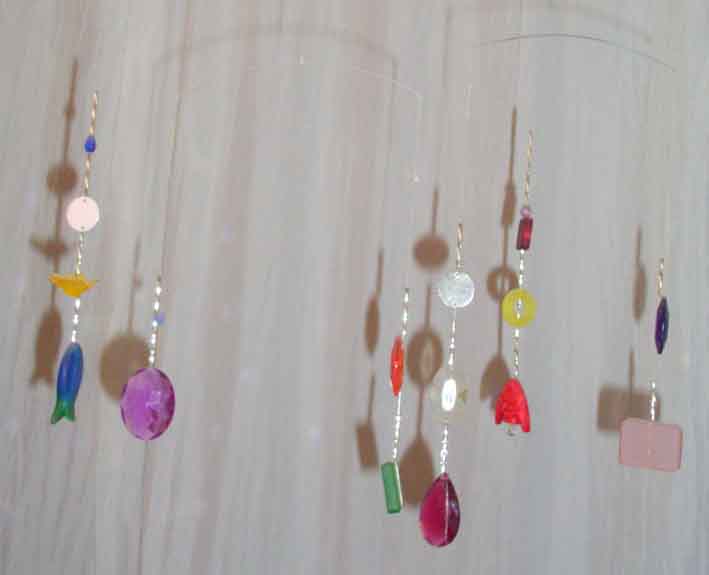für ein Kleinkind wärs mir mit Perlen zu riskant - außer, es ist wirklich so hoch aufgehängt, daß es nicht rankommt. Es gibt auch bunte Acrylsteine, die eine gute Lichtbrechung haben, gibts zB bei Interio