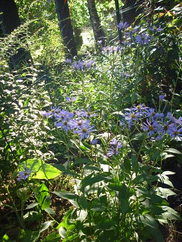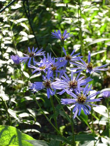 Aster macrophyllus 'Twilight' im Morgenlicht, gedeiht prima im Halbschattenbereich, neigt aber stark zu Schleppenbildung, daher nicht für den Hintergrund geeignet.