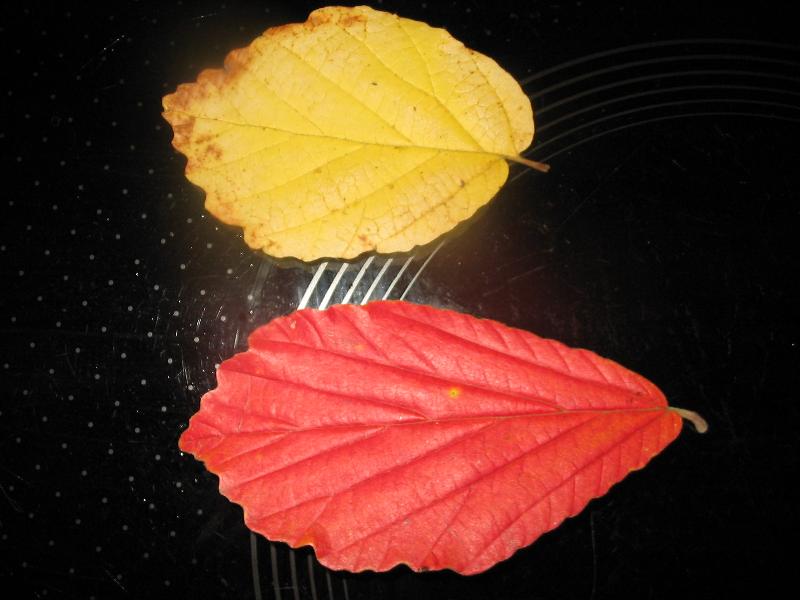 Nur das V mit dem roten Blatt treibt rot. Ganz links der Ast gelb. Weitere kleine Triebe sind gelb.
