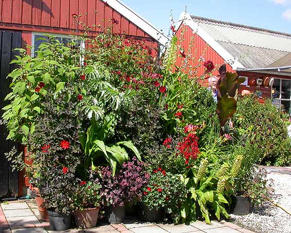 2006 habe ich im Sommer die Kleine Plantage in Eenrum/Niederlande besucht. Abgesehen davon, daß man dort schöne Pflanzen bekommt, lohnt sich auch der Besuch, wenn man nur gucken will. Besonders aufgefallen ist mir die Anordnung der Verkaufsbeete nach Farben. Die Liebe zu üppigen Farbkombinationen zeigte sich auch in den Zusammenstellungen anläßlich der Dahlien-Show, wo Stauden und Einjährige in herrlichen Kombinationen zu sehen waren.Ich habe einige der roten Kombis rausgesucht.