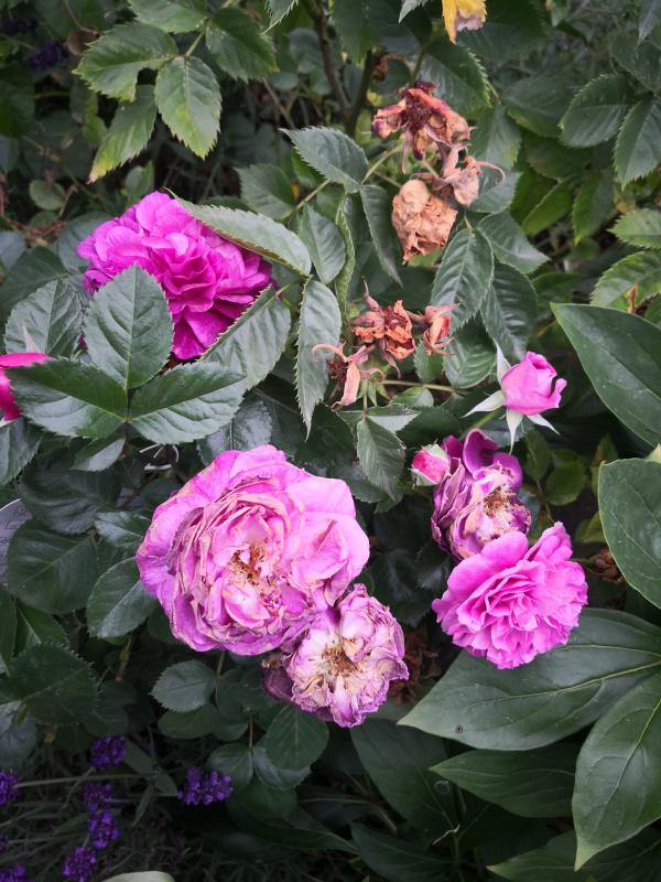Es hat hier nachdem es die ganze Zeit vorher immer trocken war vier Tage lang fast durchgeregnet. Sie sieht trozdem gut aus wie ich finde. Sie hat auch vorhin, nun aber nicht so stark wie sonst geduftet. Aufgebunden ist sie auch nach Dauerregen und Sturm nicht. Sie kann sich gut selbst tragen. Die Blüten sind variabel. Ich hatte mir wie schon berichtet ein Exemplar mehr morbidrosa ausgesucht. Als ich sie noch ohne offiziellen Namen kaufte, konnte ich aus einem Pulk blühender Containerrosen auswählen.