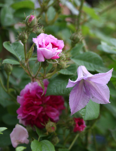 Und auch noch- 'Ghislaine de Féligonde', von lins & rechts durch- und umschlungen von 'Jackmannii superba' und 'Perle d'Azur': Sommerdschungel- 'Hiawatha' und 'Mme Le Coultre' - 'Mme Alfred Carrière' und 'Blue Angel'und... und... undUnd dann noch ...