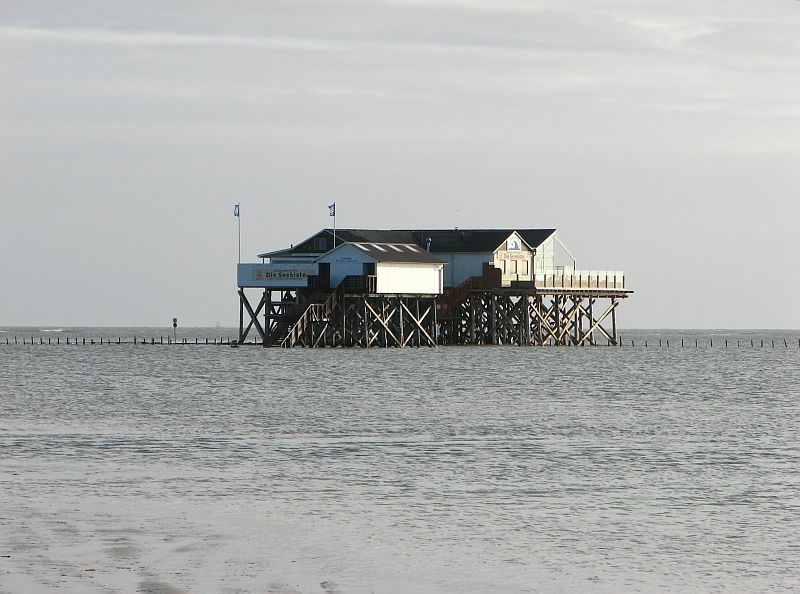 die toilettenhäuschen wirken dabei nicht ganz so mächtig wie die restaurants...Eine der Hochbeinkonstruktionen ist die letzte Kneipe vor Helgoland, einige andere "Stille Örtchen", und beides möchte man mit trockenen Füßen genießen.