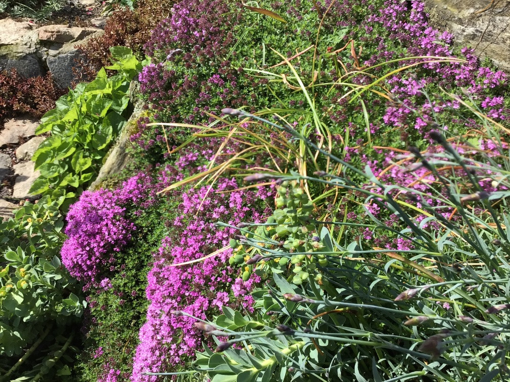 Ich hatte 2008 einen Teppichthymian auf der oberen Ebene meines Steingärtchens gepflanzt: ganz niedrig, etwas wollig behaart, macht rasch grosse Teppiche und wurzelt überall ein. Hatte ihn von Jürgen Peters, unter dem Namen Thymus cilicus var. pubescens. Blüht rosa, aber nicht übermässig. Nun sind Thymus-Arten (und wahrscheinlich erst recht Sorten) ja sehr schwer zu bestimmen, wer weiss unter welchem Namen er heute läuft.