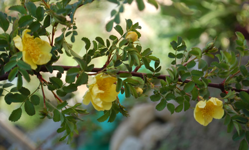 Hugonis treibt bei uns gerade mal die ersten Blättchen