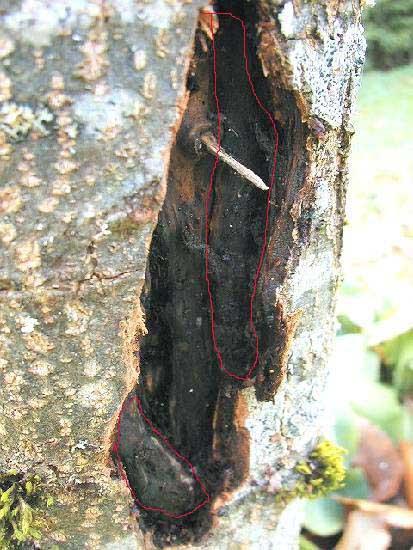 die färbung deudet mir weniger auf fäulnis hin. ich denke schlicht dreck und oberflächliches feuchtes zeug zu sehen. das hat sich angesammelt, weil die wunde doch ziemlich mit rinde überdeckt war. das hat sich mit der zeit durch regenwasser angesammelt.
