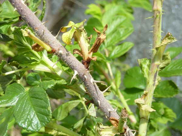So jetzt habe ich Fotos von den befallenen Trieben und habe da auch an den jungen Trieben dunkle Stellen entdeckt