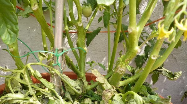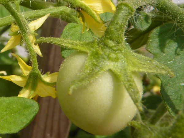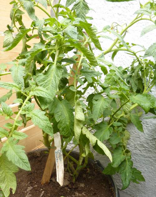 Die Johannisbeertomaten habe ich straff hoch gebunden, sonst wird die Pflanze 1,5m breit.Das ist eine der Wildformen, aus denen die Tomaten abstammen, sie steckt vor allem in Obsttomaten.