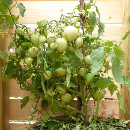 Golden Green macht einen schönen aufrechten festen Busch, die Tomaten sind wie Minifleischtomaten, leider bei mir anfällig für die Fäule.