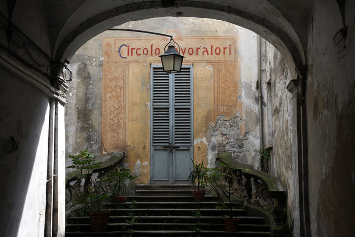 Eine mit umbra-farbenen Häusern gesäumte Gasse wie diese, sollte naheliegend durch ein kleines Städtchen in Umbrien führen. Stattdessen befinden wir uns um einiges nördlicher in einer kleinen Stadt (?) am Ostufer des Lago Maggiore zur menschenleeren, im wahrsten Sinne des Wortes verschlossenen Mittagszeit. Nur die weissen Kleider am geöffneten Fenster lassen Leben erahnen....