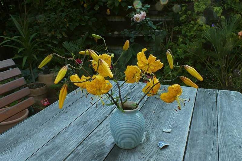 diesen "strauß" finde ich so schön wie traurig - alle drei blütenstengel waren durch das blütengewicht abgeknickt, daher kamen sie in die vase und auf den terrassentisch ... mal sehen, wieviel der regen heute nacht nun noch übrig lässt...