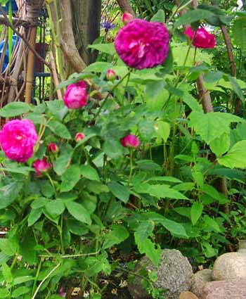Habe mir die Great Western angeschaut, sie kommt mir aber von der Blüte her viel ordentlicher vor als meine, die hat eher so verwuschelte Blüten.An Bourbonrosen habe ich die Louise Odier und die Honorine de Brabant. Vom Wuchs her sind die ganz anders, straff aufrecht. Auch haben die relativ dicke Triebe (fingerdick). Meine hat viel dünnere, feinere Triebe und ist auch nicht so "himmelstrebend".Zu den Staubgefäßen, die sieht man nicht immer so deutlich. Im Aufblühen ist sie heller und dunkelt dann nach.Hier sieht man Blüten versch. Alters. Die roten oben müsst ihr euch aber wegdenken, die gehören zu einer anderen Rose.