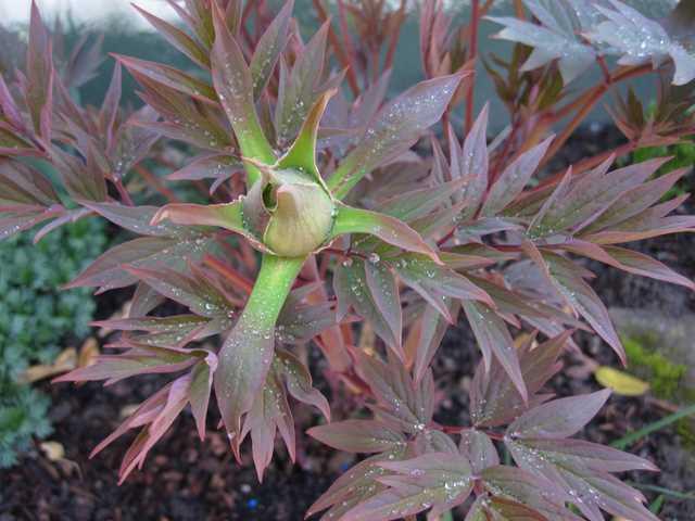 Eine Knospe von meinem ältesten Paeonia rockii-Sämling. Nachtfröste um - 4 Grad C scheinen ihr (hoffentlich) nichts auszumachen.