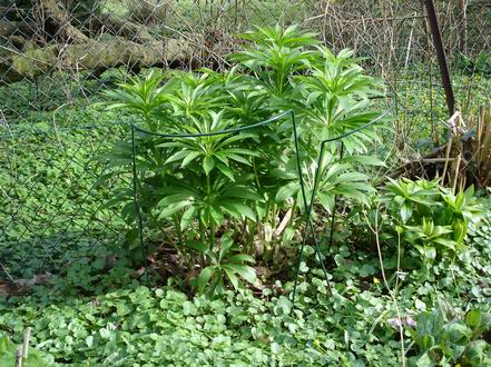 Die treibt immer superfrüh aus, jedes Jahr habe ich angst, dass sie erfreitr, aber sie hält einfach durch: Lilium hansonii.Und nun ist sie auch schon richtig hoch gewachsen, und - ich mag es gar nicht laut sagen, um das Schicksal nicht herauszufordern - ich habe noch keine roten Käferchen gesehen! Etwas weiter rechts ist übrigens ein kräaftiger Pulk von Lilium "Orange Marmalade Fox", die ich vor zwei Jahren pflanzte und die hübsch zierlich im vergangenen Jahr blühte. Es ist eine Martagon-Sorte, und weil sie so schön ist, habe ich mir im vergangenen Herbst noch eine Ladung davon gegönnt, die kommen aber gerade erst aus der Erde.