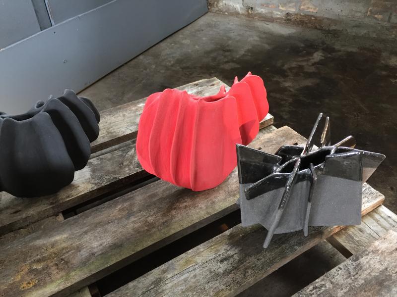 Die Vasen in Raku-Technik scheinen von Christine Lübge zu stammen.