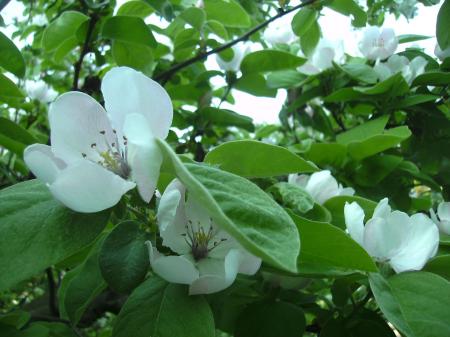 Die Quitte hat zum Zeitpunkt der Blüte schon richtig groß entwickelte Laubblätter, der Baum ist grün mit wunderschönen, wie einzeln hineingetupften Blüten.Bei den Apfelbäumen dominiert eigentlich die Blütenfarbe den Baum, weil die Entwicklung der Laubblätter etwas hinterherhinkt.