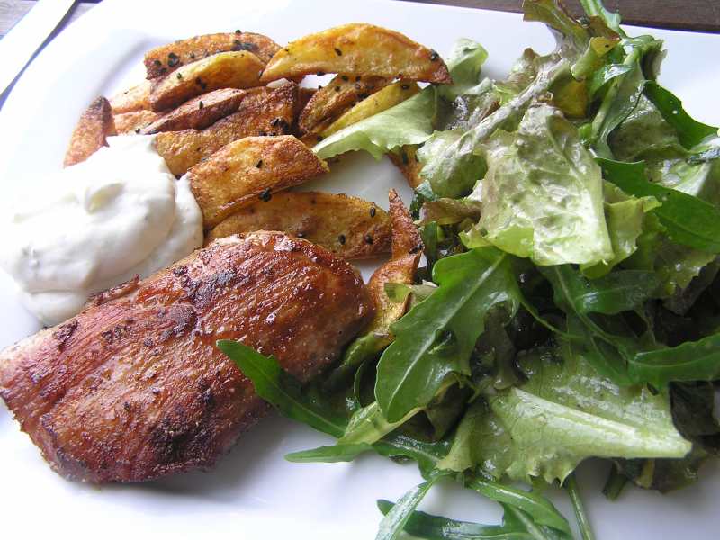 zum essen gabs gerade:putensteaks (aus der keule) dazu ofenkartoffeln mit schwarzkümmel, sour cream und pflücksalat mit rucola, frühlingszwiebeln und kräutern aus dem garten.