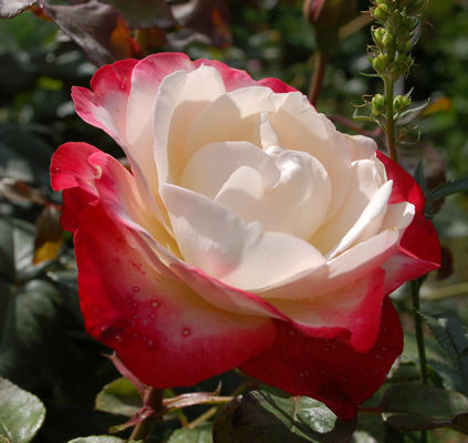 Tatsächlich hat sie wie eine Schnittrose ausgesehen, stimmt.Jetzt bin ich mal gespannt auf des Rätsels Lösung.Ich plädiere für Double Deligth, und das nicht nur ev.Die Rosenfrau am Markt hat sie jedes Jahr in großen Mengen als Schnittrose, daher kenne ich sie recht gut. Sie schwärmt übrigens auch von Wüchsigkeit und Gesundheit dieser Rose, vor allem im Vergleich zu Nostalgie. Alles paßt, Farben, Duft und Verfügbarkeit, müßte mich sehr täuschen.Kein Eintrag bei hmf - oder bin ich blind