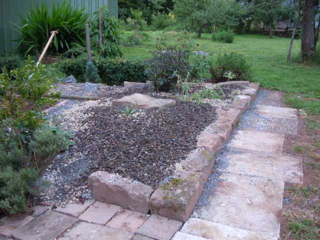 Wieder ein paar Handgriffe weiter. Mein Nachbar schmiss seine Waschbetonplatten raus. Sie wurden spontan integriert. Die Mähkante ist halt nun etwas breiter geraten ;DGemulcht hab ich mit Lava und Bims. Es muss aber noch ein bißchen drauf.Die Dahlie "Bishop of Llandaff" hab ich im Beet "entsorgt". Sie war in nem Kübel und musste "weg". GGf. kommt sie ja wieder. Werde sie mal etwas abdecken im Winter.In der Ecke ist ne Pinus sylvestris "Fastigiata", die mir gestern im Baumarkt für 6 Euro begegnet ist. Die musste einfach mit.Ansonsten hab ich erst mal die "original aus USA-Saatgut Yucca filamentosa" mit rein, Zauschneria calfornica und Euphorbia characias ssp. wulfenii (obs die aushält??)Ist aber noch nicht fertig. Erysinum werd ich auch noch reintun.
