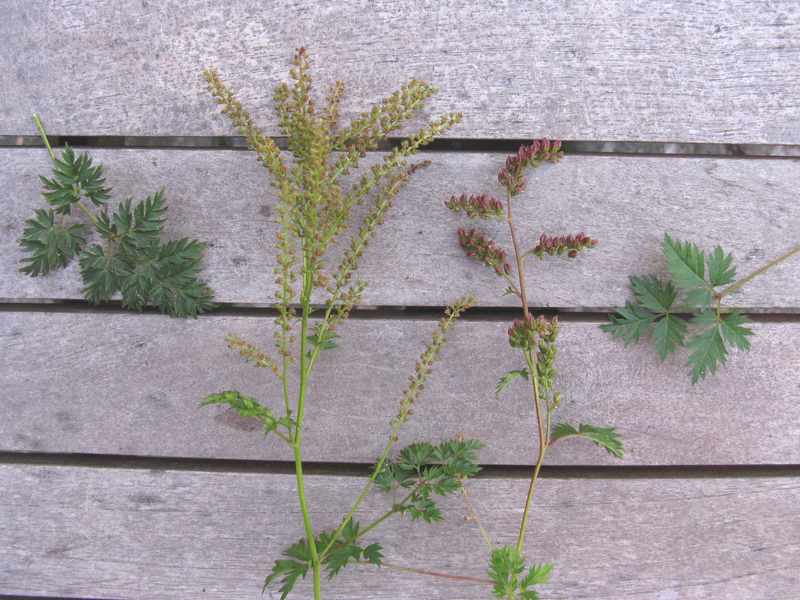 Heute habe ich einen Aruncus aethusifolius mit nach Hause genommen, der mir wegen seiner rötlichen Samenstände auffiel.Unten ein Vergleich mit der Pflanze die ich schon seit Jahren im Garten habe (Links im Bild). Nicht nur die Blüten-/Samenstände unterscheiden sich sondern auch das Laub.Es müssen wohl männliche und weibliche Pflanzen sein?