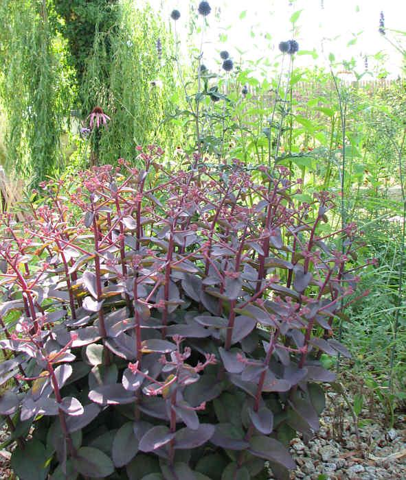 Also pearls vernichtende Einschätzung kann ich überhaupt nicht nachvollziehen. Für mich sind die hohen Sedums unverzichtbar im Beet, weil sie auch im "wilden" Spätsommer wunderbar Ordnung - und im Falle der rotblättrigen Sorten - auch Farbe ins Beet bringen. Sie wachsen hier wunderbar.Der Boden ist gut durchlässig und eher nährstoffarm, ich dünge aber mineralisch.Freilich - im Lehmboden bei meinen Eltern sind die hohen S. eine Katastrophe - sie fallen leicht auseinander und werden Opfer von irgendwelchen Miniermotten (die eklige Fraßgänge zwischen den fleischigen Blättern erzeugen).Gezeigt habe ich das eine oder andere Photo hier sicher schon - ich werde demnächst mal neue knipsen.Man sieht übrigens gut, dass die rote Laubfarbe im Laufe des Sommers intensiver wird. Der Austrieb ist eher ein dunkles grün.Erstmal die Sorte 'Purpele Emperor', etwa 6 Jahre, gepflanzt als etwas größere Pflanze: