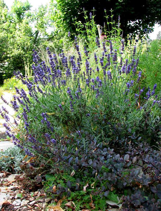 einmal auch als Solitär vor einer Lehmziegel-Mauer mit rotlaubigem Sedum spurium als Unterpflanzung, im Kontext mit Centranthus ruber, Nepeta 'Walker's Low'